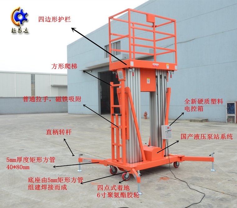 鋁合金升降平臺又稱為桅桿式升降平臺,分為單柱雙柱三柱四柱升降平臺,超易達機械生產的鋁合金升降平臺質量上乘,小編親自操作過鋁合金升降平臺而且站在升降平臺上升高10米并沒有感覺任何的晃動,超易達機械升降機械專業(yè)的升降機械廠家,歡迎廣大用戶到廠參觀。